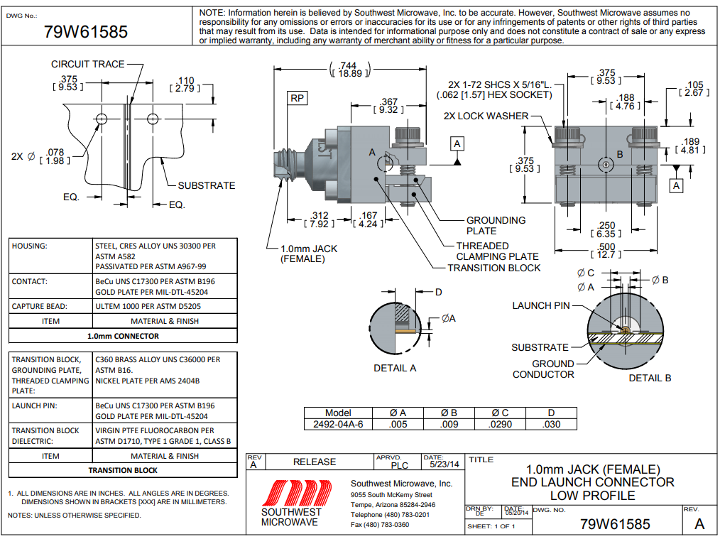 引腳/電物質口徑:0.005 / 0.0290