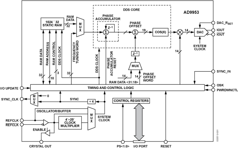 AD9910是一款直接數字頻率合成器(DDS),具有集成的14位DAC,支持高達1 GSPS的采樣速率。AD9910利用高級的專有DDS技藝,可都不舍棄性能參數的現象下明顯的大幅度降低工作電壓。DDS / DAC組和出現數字化可代碼編程高頻虛擬的輸出合成圖片器,能夠在達400 MHz的速度下制造速度捷變的正弦函數波形圖。