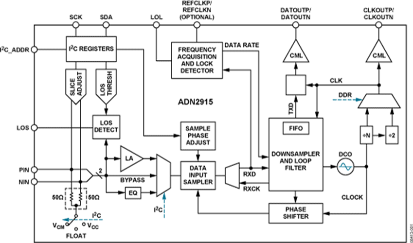當(dang)輸入(ru)信號(hao)(hao)電平降至用戶可(ke)編(bian)程(cheng)閾值以(yi)下時,接收器(qi)前端信號(hao)(hao)丟失(LOS)檢測(ce)電路會予以(yi)提(ti)示。LOS檢測(ce)電路具有(you)遲(chi)滯特性,可(ke)防止LOS輸出(chu)震(zhen)顫。此外,可(ke)通過(guo)I2C寄存器(qi)讀取輸入(ru)信號(hao)(hao)強度(du)。