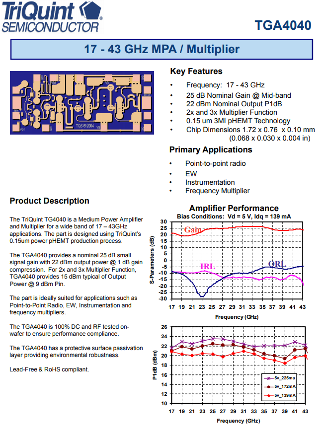 TGA4040頻射變成器是Qorvo平臺集團旗(qi)下服務,而Qorvo單(dan)位是(shi)外(wai)國人知名(ming)度研(yan)究開發(fa)調小器企業主,緊跟(gen)世紀發(fa)展方向不停升級更新(xin)技藝基本知識(shi),供給全球(qiu)主要、最具(ju)獨(du)特的 GaN-on-SiC 產品(pin)設備(bei)(bei)樂隊組(zu)合,幫(bang)助買家特殊增強(qiang)(qiang)率(lv)和本職工作帶寬起步,新(xin)產品(pin)開發(fa)產品(pin)設備(bei)(bei)越(yue)(yue)多(duo)越(yue)(yue)具(ju)備(bei)(bei)質量及買家的要,TGA4040rf射頻調大(da)器是(shi)17-43 GHz增加(jia)收益塊2x和3x乘數,強(qiang)(qiang)性(xing)能指標及使用使TGA4040更越(yue)(yue)受國際金到大(da)眾們喜愛