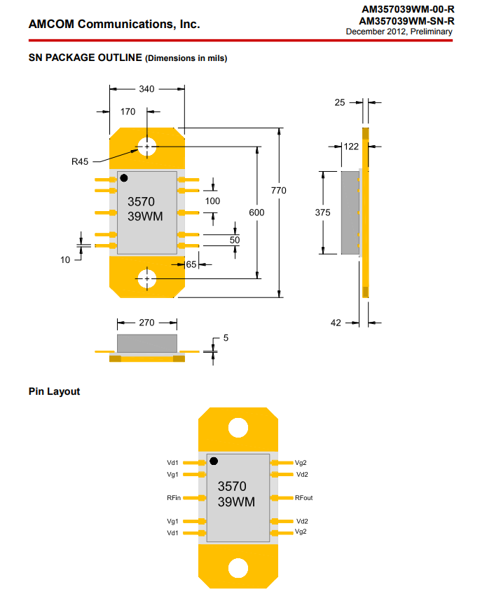 AMCOM的(de)(de)AM357039 WM是(shi)寬帶網(wang)絡(luo)GaAs MMIC馬力圖(tu)像(xiang)放大電(dian)(dian)路。它有顆個(ge)21dB小的(de)(de)信號增(zeng)加收(shou)益(yi)和(he)(he)37.5dBm(7W)過剩的(de)(de)電(dian)(dian)機額定工率CW能力打出馬力超過了(le)3.5至(zhi)7GHz頻(pin)段。MMIC在(zai)兩根心片(-00—R)中帶來(lai)了(le)。包(bao)(-SN-R)表單(dan)控件(jian)。該AM357039 WM SN-R是(shi)在(zai)瓷磚打包(bao)封裝與A活套(tao)法蘭和(he)(he)直RF和(he)(he)DC引(yin)發配備增(zeng)漲。因直流(liu)電(dian)(dian)壓馬力高耗散(san),積極(ji)的(de)(de)散(san)熱(re)性能是(shi)必不(bu)可少(shao)的(de)(de),心片MMIC需要(yao)裝設采用(yong)進行在(zai)鋁(lv)合金(jin)脊勤(qin)奮努力行共晶釬焊。集成塊(kuai)和(he)(he)封裝類型有的(de)(de)是(shi)ROHS服從的(de)(de)