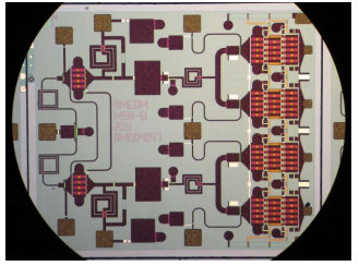 獲得超過20dB的功率增益,這是一個標稱規格在許多應用中,兩階段配置與基于TrimQuin的0.25m選擇級間匹配GaN HEMT工藝。圖1示出50W單片集成電路的照片。第一級器件尺寸為2.4mm,分為兩個1.2mm的路徑。第二級器件尺寸為16.8mm。