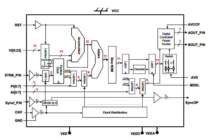DS875A是一種高速直接數字合成器(DDS),具有相位調制和幅度調制輸入端口,設計用于直接極性調制或QAM應用。它具有24位的頻率調諧分辨率,8位的相位調制輸入和8位的幅度調制輸入。內部ROM具有12位的相位分辨率,內部DAC具有11位的幅度分辨率。DAC的模擬輸出可以在正常保持模式(對于第一奈奎斯特頻帶)和返回到零模式(對于第一、第二和第三奈奎斯特頻帶)操作之間進行選擇。正弦波可以用DAC的正常保持模式產生接近1.2GHz(以2.5GHz時鐘速率)的第一奈奎斯特頻帶,或者用DAC的歸零模式產生大約3.7GHz的第三奈奎斯特頻帶。初始相位可以重置到由相位比特輸入決定的任何程度,以開始。該芯片有一對互補模擬輸出50Ω后端。DAC模擬輸出由8位數字輸入數字控制到256級。輸出波形的頻率可以由24個頻率控制位Vi [0:23 ]來控制。輸出波形的相位可以由8位PI[0:7]相位調制輸入調制,并且模擬輸出可以由8位AI [0:7]調制。調幅輸入。該DS875 A接受單端時鐘輸入,并具有50 -片上芯片后端接地。頻率字、相位字和振幅字輸入都接受LVTTL/CMOS輸入電平。差分同步輸入SyncI_P/N為多個芯片應用提供同步,并且以相同相位的同步輸出啟動每個芯片,SyncOP準備接受頻率字、相位字、振幅字和選通輸入。同步選通輸入由內部產生的分頻8時鐘鎖存,這些時鐘也被發送到輸出引腳同步碼。同步器。可以用作基準,將頻率字、相位字、振幅字和選通信號輸入定時對準同步到內部除以8時鐘,以便正確鎖存所有輸入。復位是異步的,以最小化模擬輸出的時鐘延遲的有效性。對內部定時進行了優化,以避免在頻率字和/或相位、振幅字轉換期間或復位之后的時鐘滑動。DAC的模擬輸出可以在正常保持模式(對于第一奈奎斯特頻帶)或歸零模式(對于第一、第二和第三奈奎斯特頻帶)操作之間選擇。結合可選擇濾波器,可以產生從DC到第三奈奎斯特頻帶的超寬帶信號。只有一個5V電源是必需的。