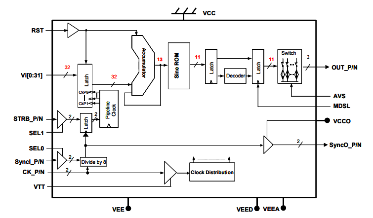 DS872是一種高速直接數字合成器(DDS),頻率調諧分辨率為32位,ROM相位分辨率為13位,DAC幅度分辨率為11位。DAC的模擬輸出可以在正常保持模式(對于第一奈奎斯特頻帶)和返回到零模式(對于第一、第二和第三奈奎斯特頻帶)操作之間進行選擇。正弦波可以用DAC的NormalHold模式產生接近1.5GHz(以3GHz時鐘速率)的第一奈奎斯特頻帶,或者用DAC的Re.-to-Zero模式產生約4.5GHz的最多第三奈奎斯特頻帶。初始階段可以重置為零度開始。該芯片有一對互補模擬輸出50Ω后端。輸出波形的頻率可以由三十二個頻率控制位控制,VI[0:31]。DS872接受差分時鐘輸入或單端時鐘輸入,并且具有具有用戶定義的閾值的50_片上后端子。頻率分辨率位接受LVTTL或CMOS輸入電平。差分同步輸入SyncI_P/N為多個芯片應用提供同步,并且啟動每個芯片準備接受頻率字輸入。同步選通輸入由內部產生的8分頻時鐘的過渡邊鎖存,這些時鐘也被發送到輸出管腳SyncO_P/N。SyncO_P/N.可以用作參考來同步頻率字和選通信號輸入定時與內部分頻8c的對準。鎖閂正確。復位是異步的,以最小化模擬輸出的時鐘延遲的有效性。優化內部時序以避免頻率字過渡或復位后的時鐘滑動。只需要一個5V的電源。